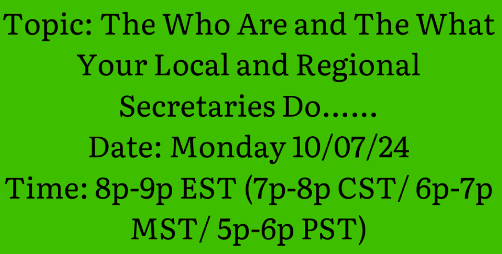 Topic: The Who Are and The What Your Local and Regional Secretaries Do…… Date: Monday 10/07/24 Time: 8p-9p EST (7p-8p CST/ 6p-7p MST/ 5p-6p PST)